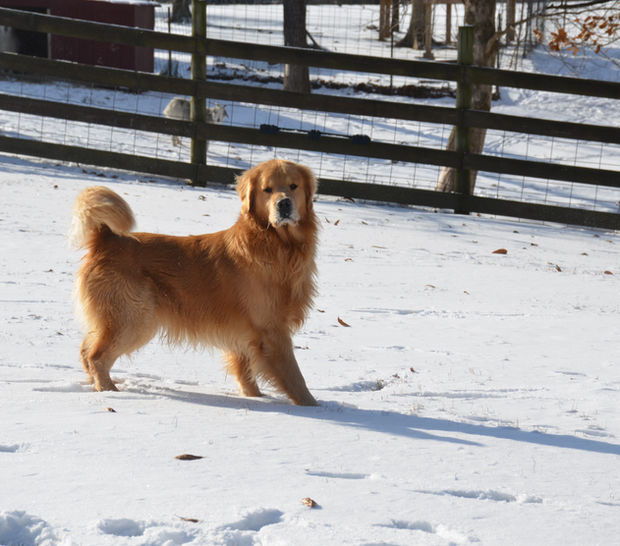 Max has a beautiful Golden coat and a wonderful headset with a big blocky head. He loves to play fetch and jump in the pond when you throw his ball. He has a very loving personality. He has produced beautiful Goldens for our program and is our current standing male.